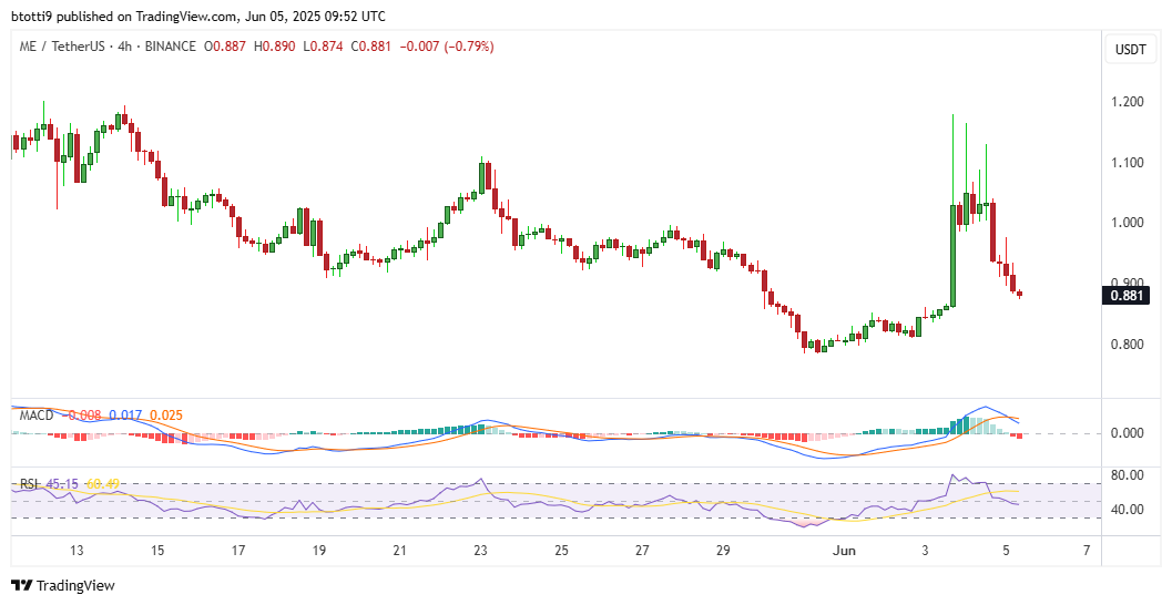 Earlier this week, the ME token saw a significant spike, rising sharply to $1.15 from approximately $0.80 amid heightened trader enthusiasm. The catalyst for this surge was the announcement of a branded Trump crypto wallet, which drew considerable attention.
